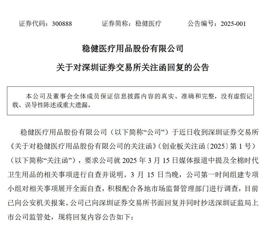 3月20日收盘后,全棉时代母公司稳健医疗(300888.SZ)发布回复深交所关注函的公告。