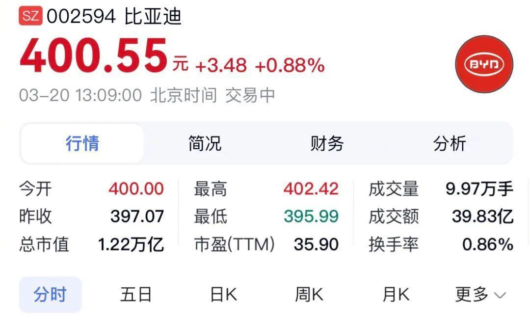 3月20日开盘,比亚迪(002594.SZ)高开0.74%,股价首次突破400元/股大关并创历史新高,盘中一度涨至403.4元/股。截至收盘,比亚迪报收399.99元/股,涨幅为0.74%,总市值1.22万亿元,位居深市市值第一。