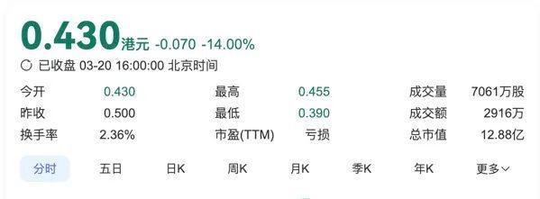 3月19日,中手游发布盈利警告,预计截至2024年12月31日止年度将录得不超过22亿元的净亏损。3月20日上午,中手游一度跌超20%。截至记者收盘,报0.430港元/股,跌14.00%,市值约12.88亿港元。