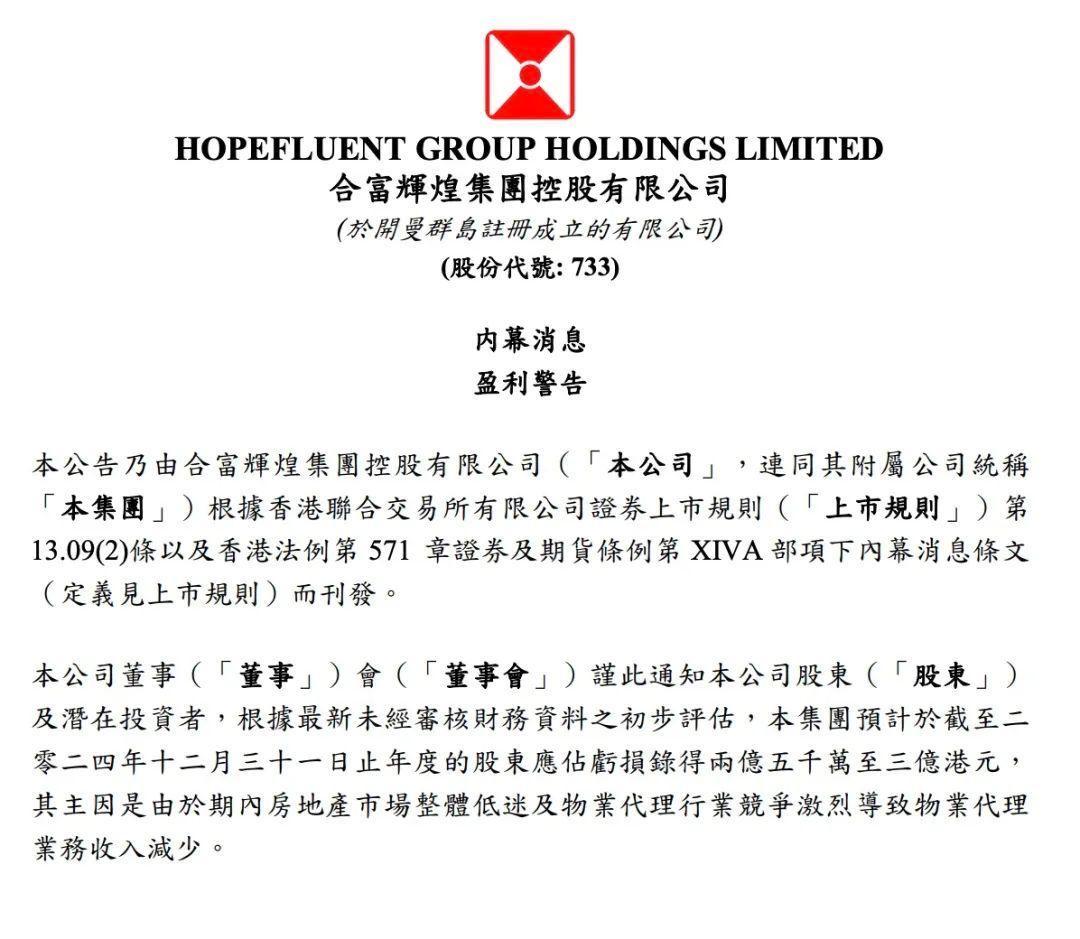 3月19日,合富辉煌发布内幕消息,公司预计2024年亏损金额介于2.5亿至3亿港元之间。究其原因,除了房地产市场整体低迷,物业代理行业竞争激烈,也导致其物业代理业务收入在减少。这也意味着,从2021年度到2024年度,合富辉煌已经连续4年亏损。